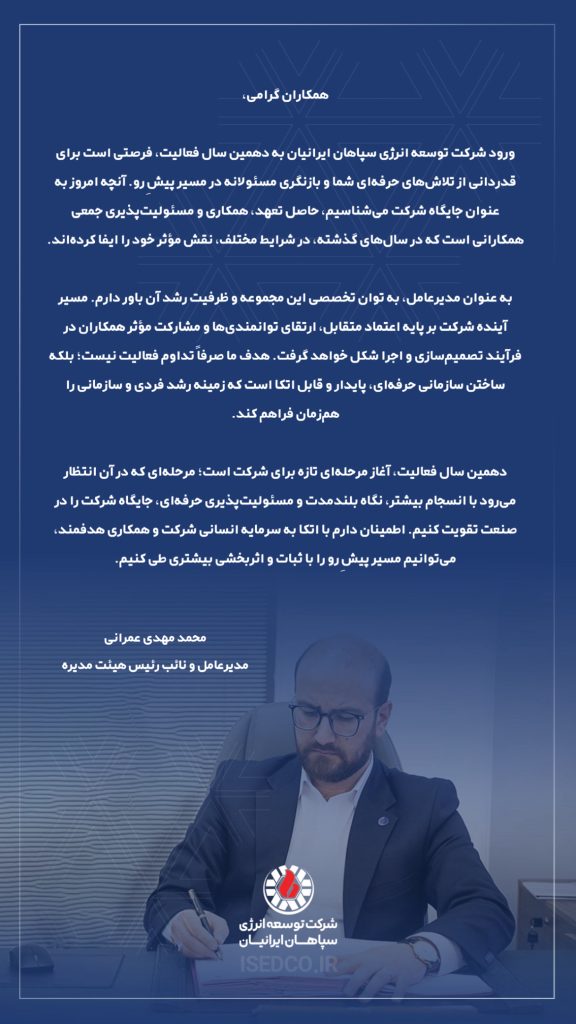 ورود شرکت توسعه انرژی سپاهان ایرانیان به دهمین سال فعالیت، فرصتی است برای قدردانی از تلاش‌های حرفه‌ای شما و بازنگری مسئولانه در مسیر پیشِ رو. آنچه امروز به عنوان جایگاه شرکت می‌شناسیم، حاصل تعهد، همکاری و مسئولیت‌پذیری جمعی همکارانی است که در سال‌های گذشته، در شرایط مختلف، نقش مؤثر خود را ایفا کرده‌اند.