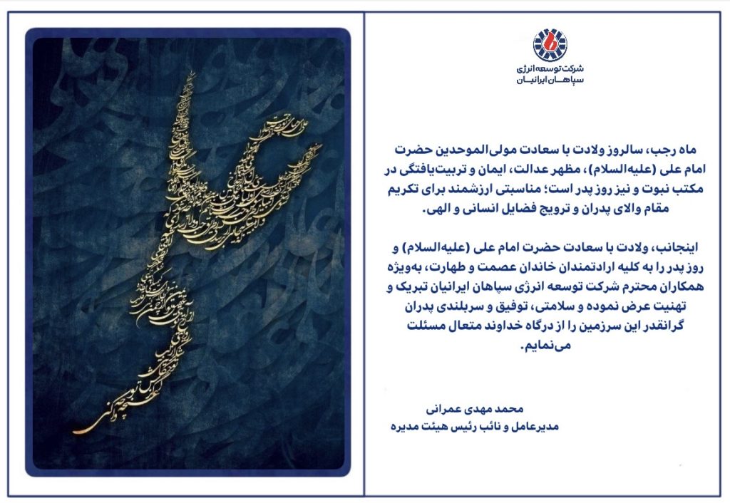 پیام تبریک مدیرعامل شرکت توسعه انرژی سپاهان ایرانیان به مناسبت ولادت حضرت علی(ع) و گرامیداشت روز پدر